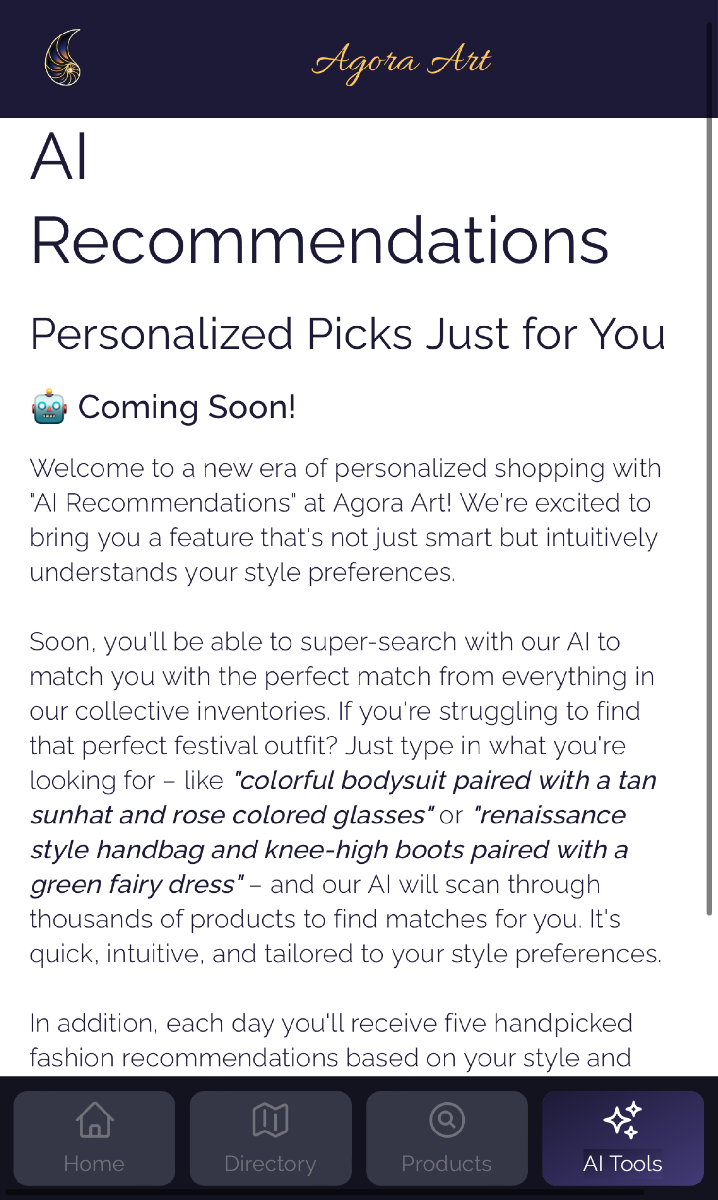 Combining the design challenges with specific functionalities, our Client, Agora Art, tasked us with designing the user interface for their “Product Search” page and assisting them visualizing the Ask AI + Daily Recommendation pages.