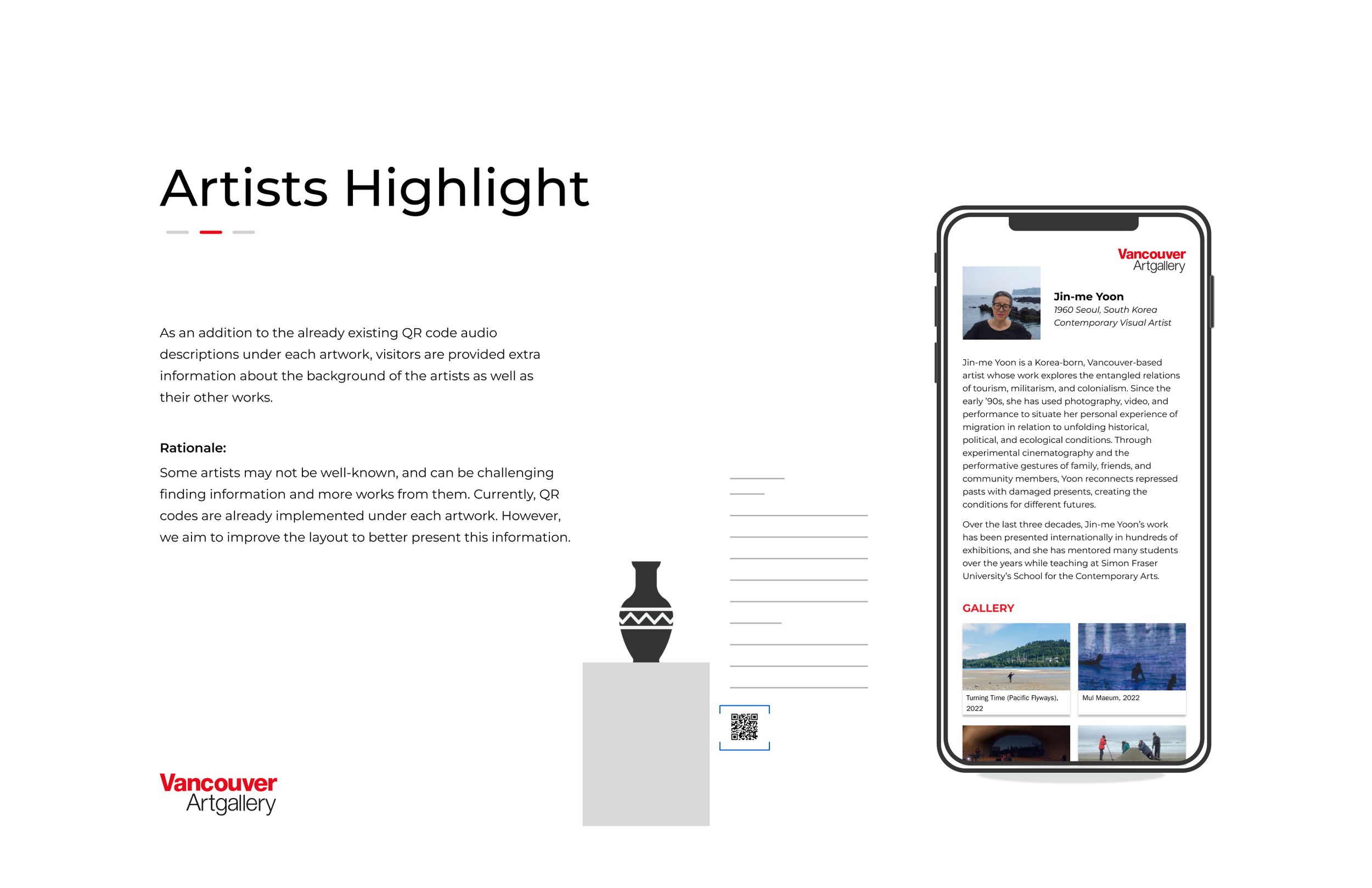 The project provided me with a complete experience of the design process, allowing me to identify my strengths and weaknesses in the field. Through this project, I was able to gain valuable insights into the entire process and practice each step. My learning from this project helped me to improve my design approach and equipped me with practical skills that are essential to my profession.Working with the Vancouver Art Gallery was a unique and invaluable experience. I learned how to communicate effectively with stakeholders, exchange ideas, understand their needs, present our design solutions, and obtain constructive feedback.Conducting interviews and designing online questionnaires for visitors was an excellent opportunity for me to enhance my research skills. I learned to avoid asking leading questions and developed strategies to gather core information within a limited timeframe. By organizing my questions in a better way, I was able to get the most out of my research.