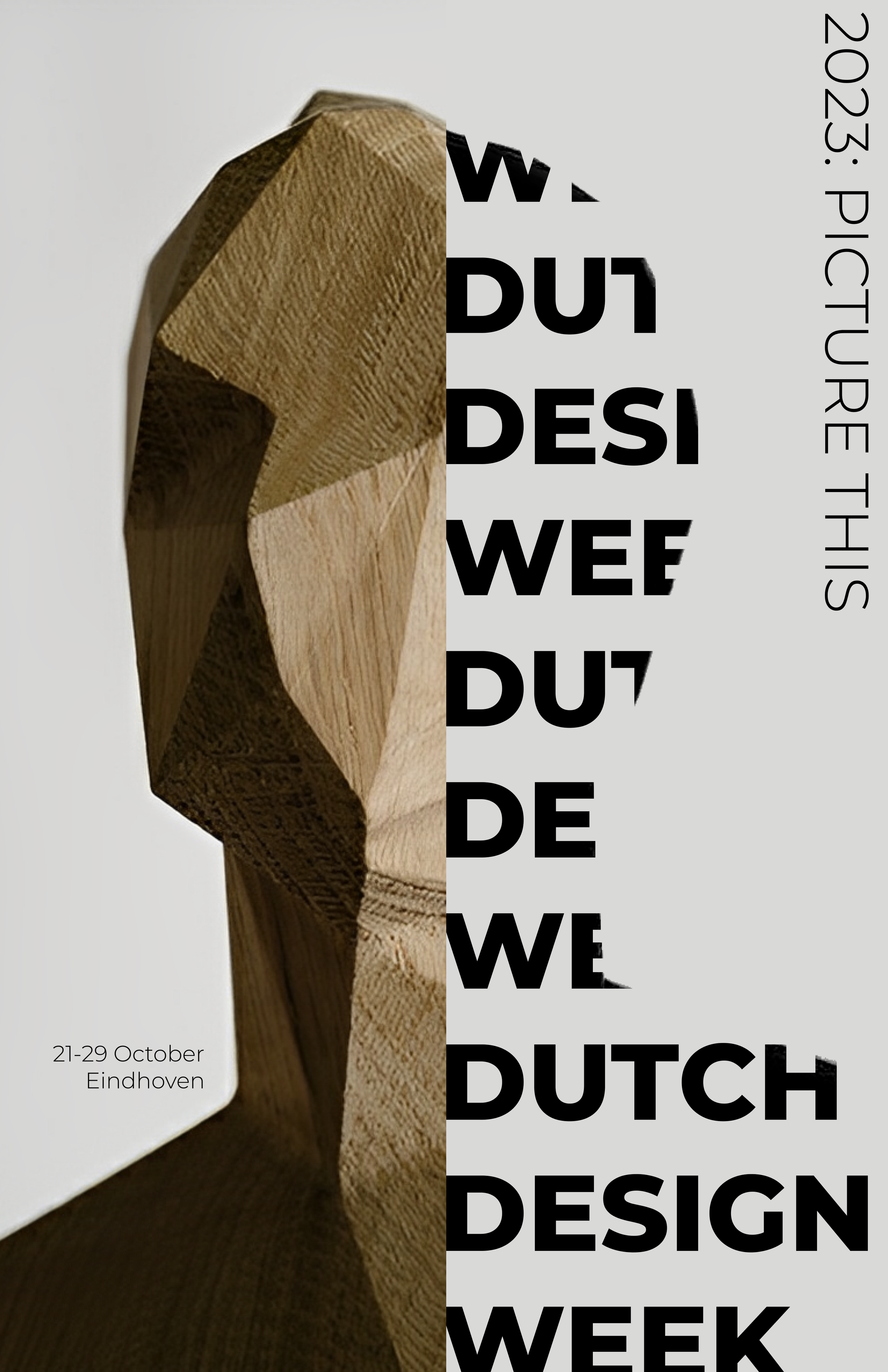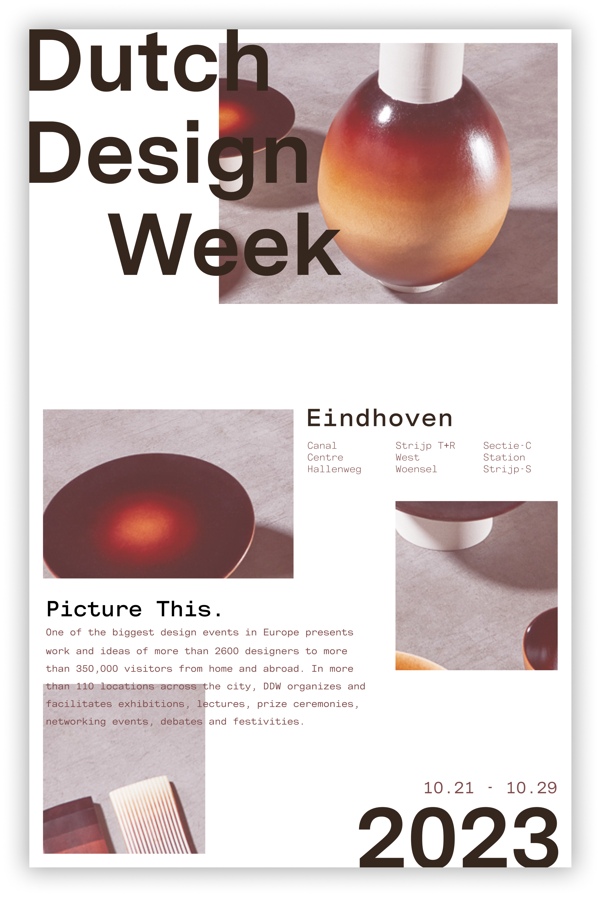 A neutral brown palette with hints of orange and yellow matches the image, giving the poster a warm autumn feeling. We want to convey an idea that the turning of fall brings along the Dutch Design Week.